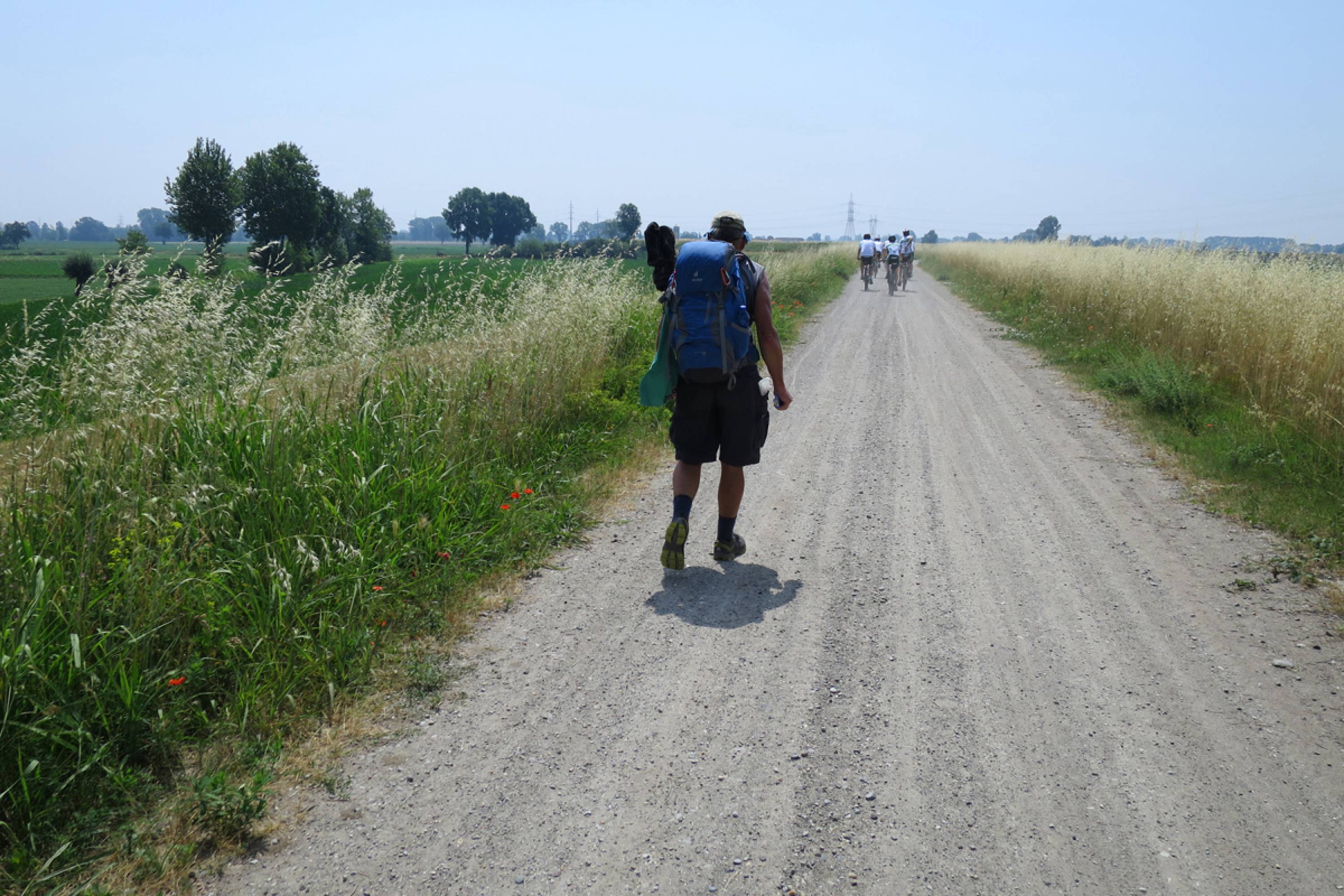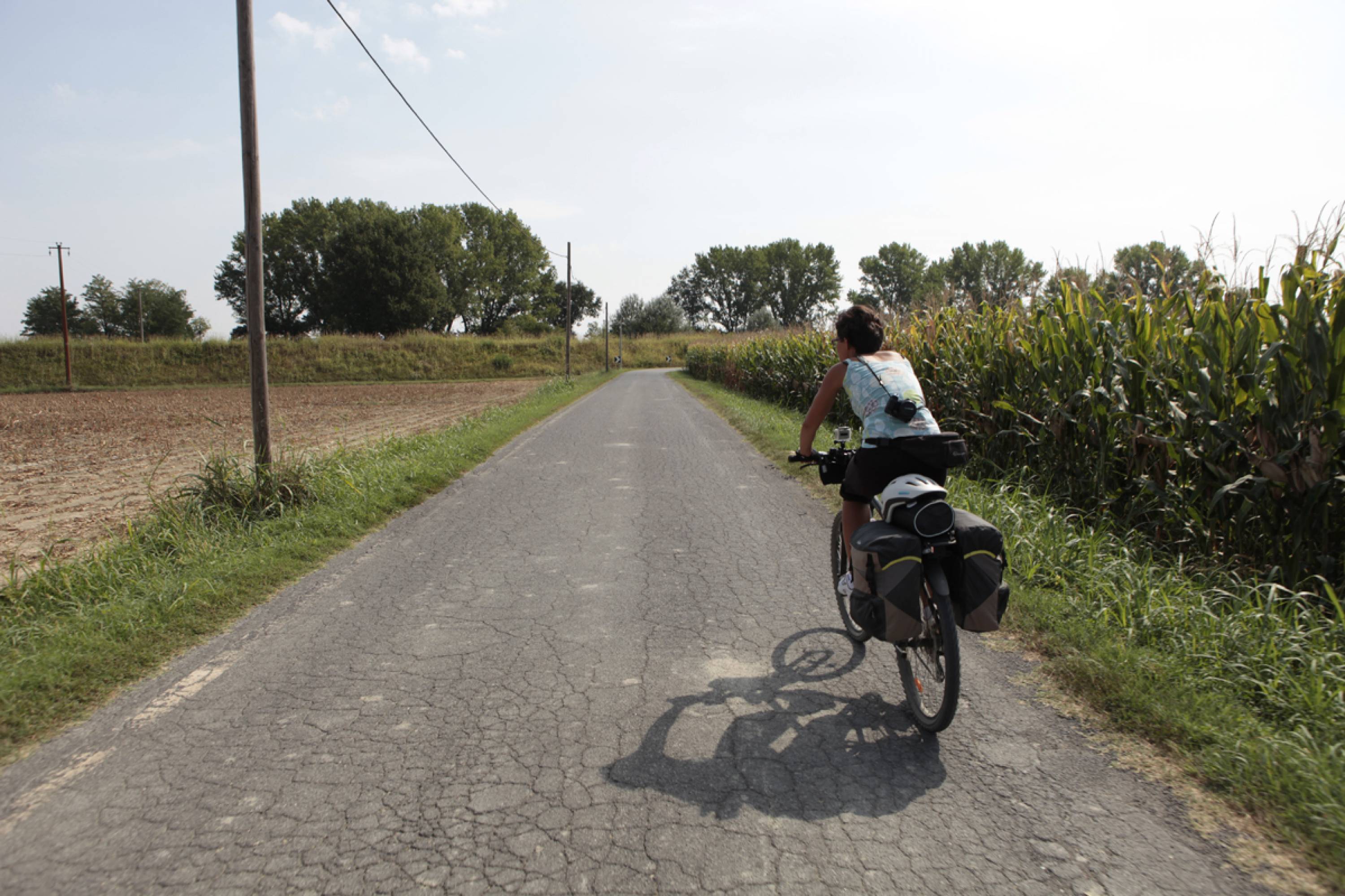 L'attraversamento della vallata del Po meriterebbe un andamento lento. Le decine di piccoli borghi prima in alto sul fiume, Carmagnola, Gassino, Valenza, Arena Po, San Zenone, poi appoggiati all’argine maestro, Caorso, Zibello, Roccabianca, Colorno, Casalmaggiore, Viadana, Brescello, Boretto, Gualtieri, Guastalla, Ostiglia, Revere, Bondeno, Mesola, Contarina si fissano nella memoria non solo per i porticati, il rosso del mattone, i palazzi e i castelli ma anche per gli incontri con la gente di Po che offre sempre spunti di riflessione, bellezza e cucina locale. E in mezzo edifici rurali, cascine, corti, abitazioni da “casanti”, a volte ancora abitati da uomini e mandrie, a volte abbandonati e segnati dal tempo.